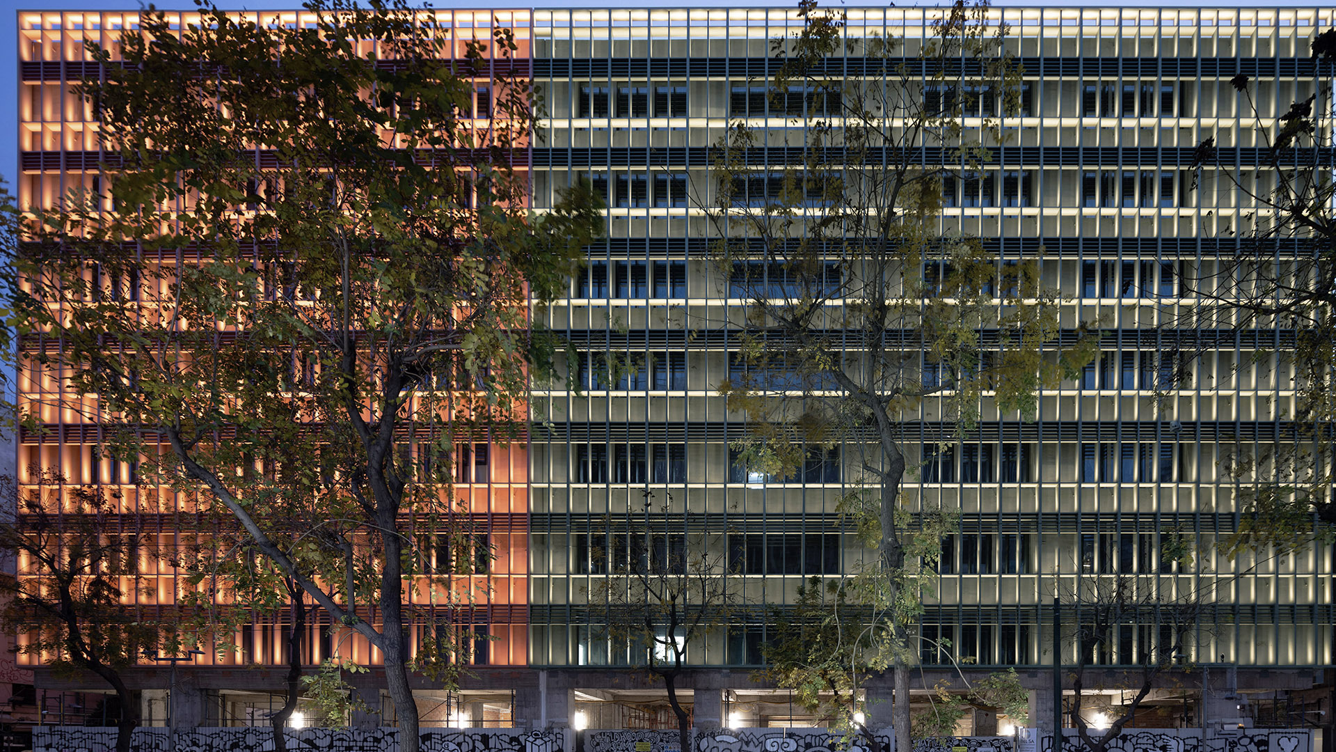 The regenerated, bioclimatic building was illuminated in three colors, orange, which was MINION’s trademark, olive green, and white, a few months before the completion of the project, highlighting the new architecture of the facades and the creation of a night landmark in the center of Athens, as an integral part of Athens new image, environmentally responsible towards its energy consumption and light pollution.