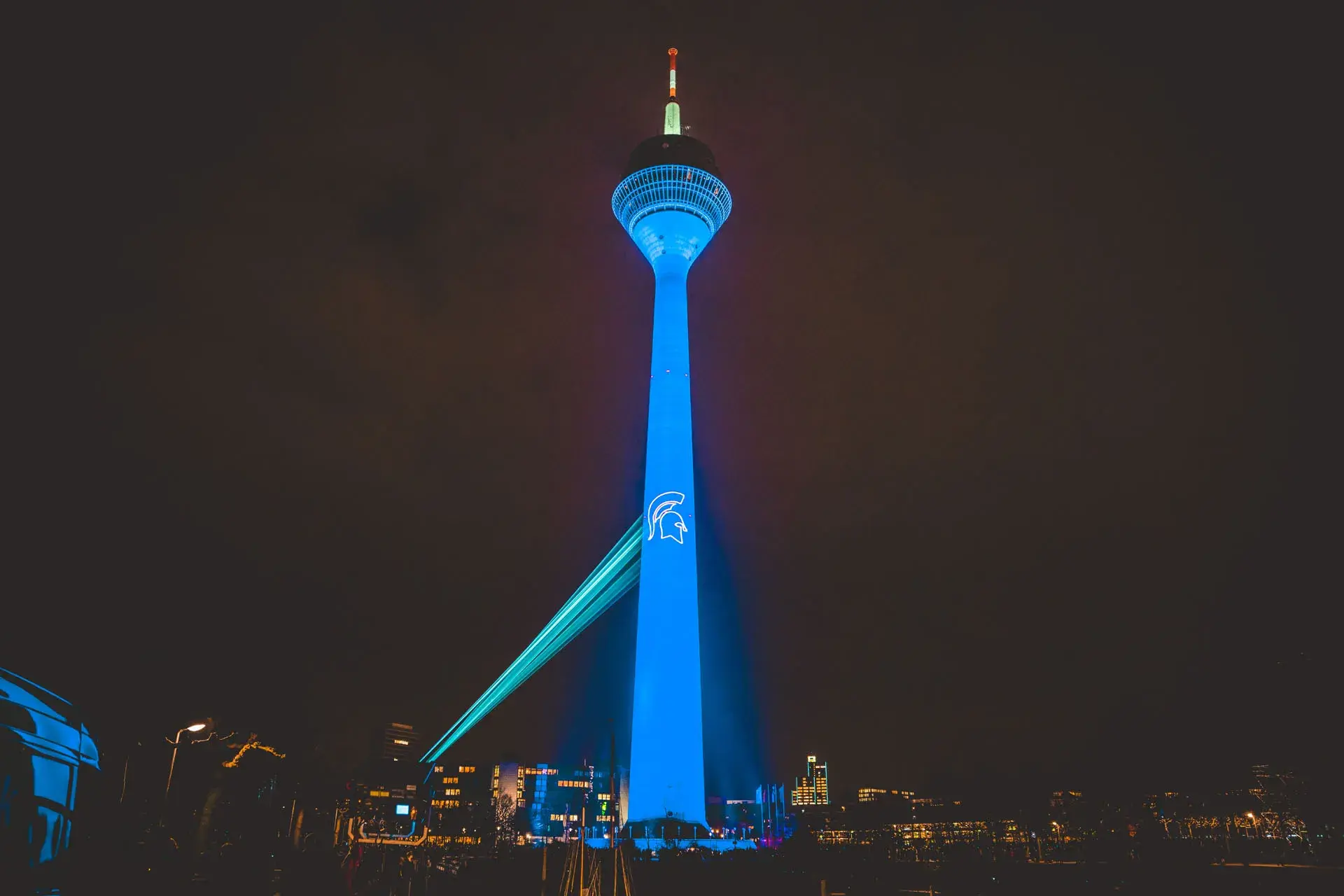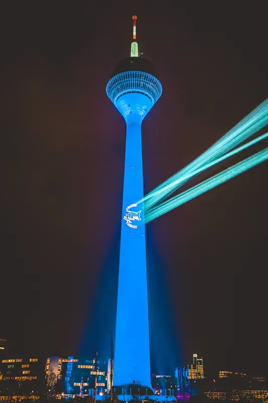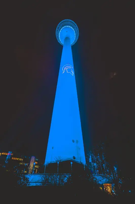 The Rhine Tower, the emblematic building of Düsseldorf, was dressed in blue and white with the sponsorship of ELVIAL.
