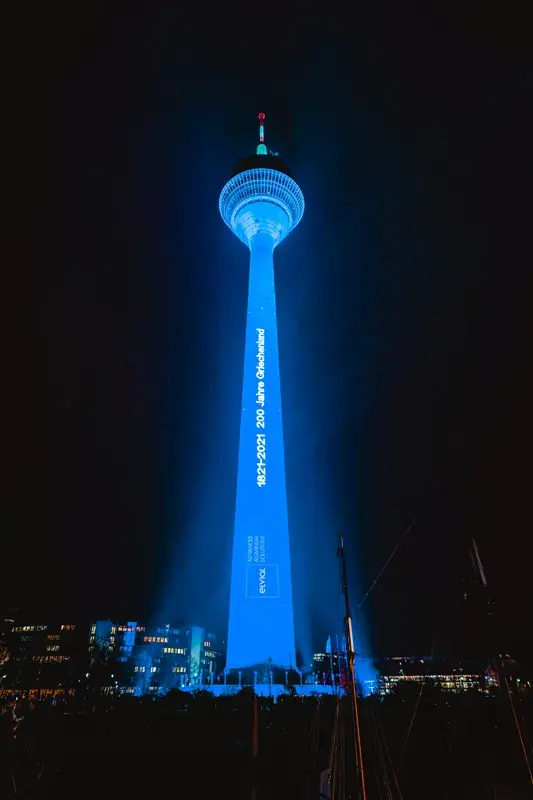 ELVIAL, with its export activity and the multilevel extroversion in all its corporate activities, contributed to the emphasis of the presence of the Greek element in the largest market in Europe. The light show at Rheinturm was a moment where the Greek community symbolically presented its history and its international orientation. ELVIAL proudly helped the event, which was characterized by innovation, high aesthetics and Greekness.