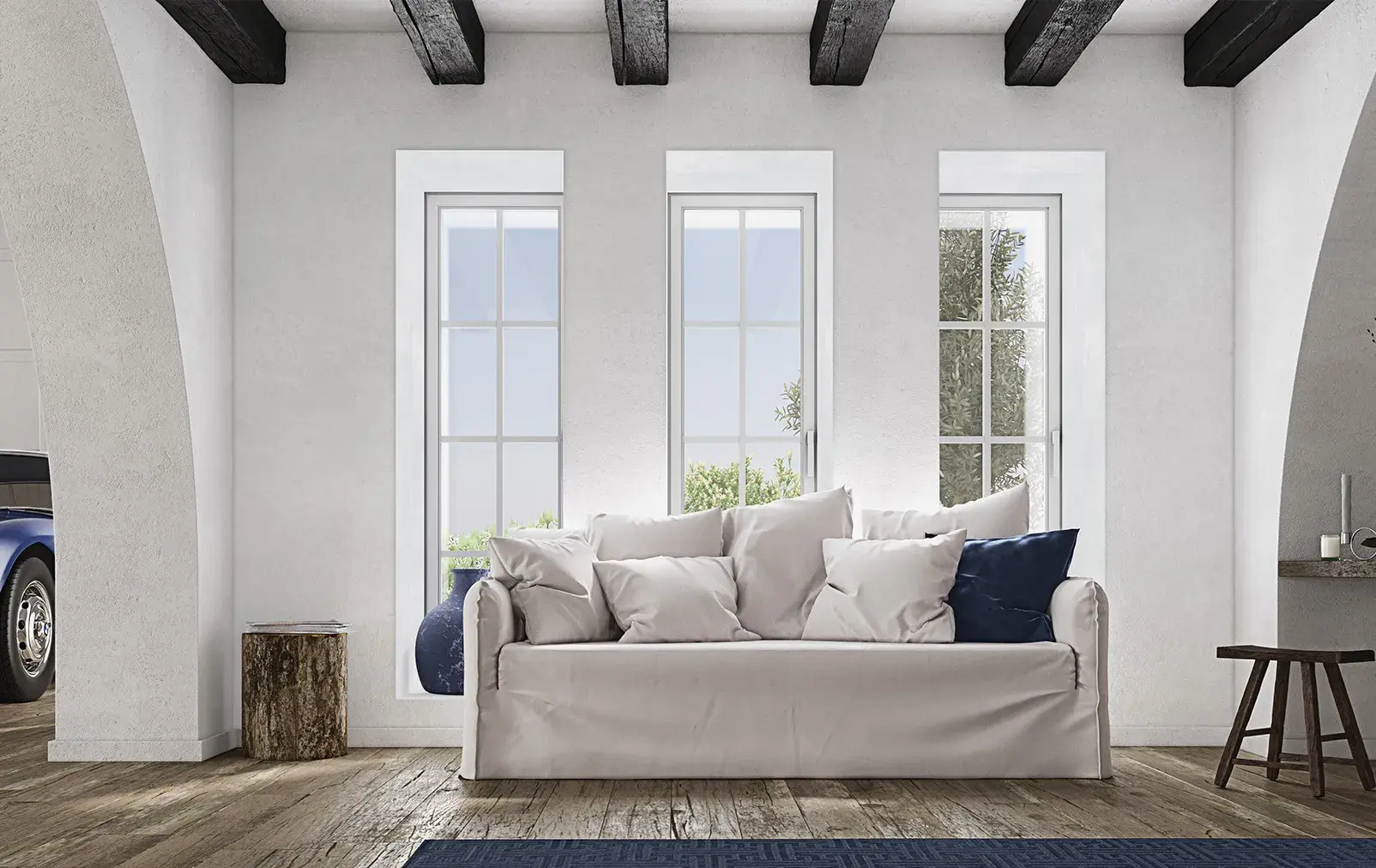 The minimal design meets the iconic inner contour, creating a new visual experience that enhances your interior space. Thanks to its flexibility and adaptability, this hinged aluminum system integrates seamlessly into any type of project, offering a distinctive aesthetic identity. The advanced ELVIAL I² technology completes the result, ensuring high energy performance and absolute comfort throughout the year.
