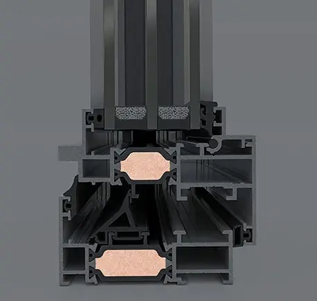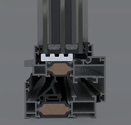 Wide insulating bars with 25% glass fibre reinforcement of 0 14/16in, are applied to all system profiles, offering high thermal insulation levels and extra rigidity. -