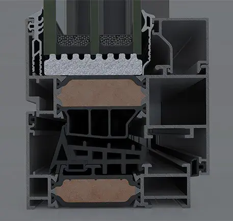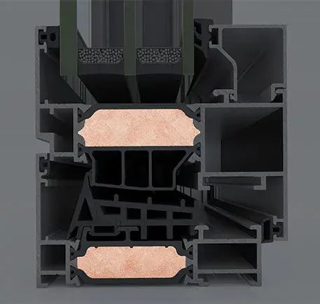 Wide insulating bars with 25% glass fibre reinforcement of 1 5/8in are applied to all system profiles, adding extra thermal insulation of PASSIVE HOUSE, level I category and extra rigidity. -